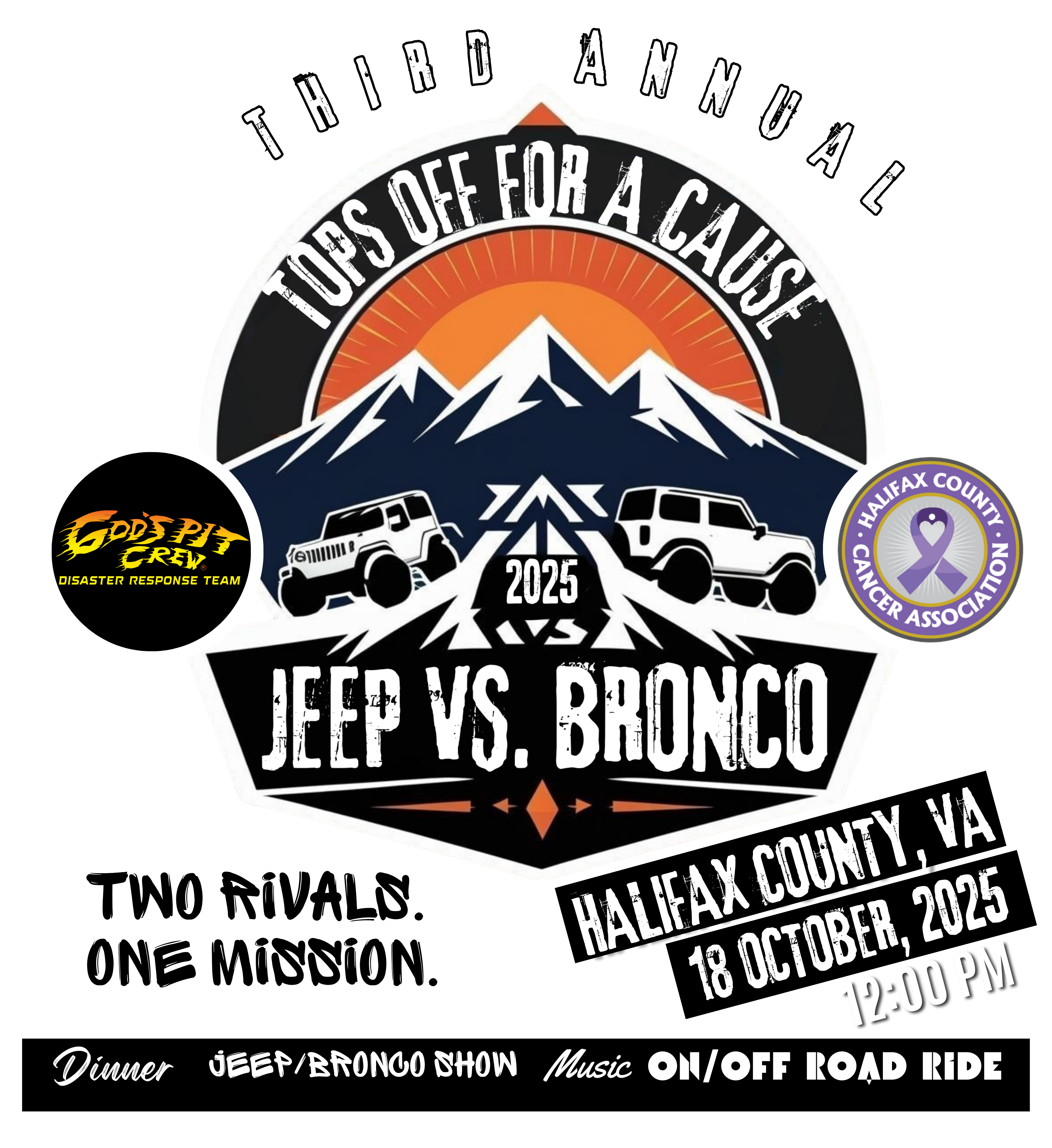OCTOBER 18, 2025 @ 12:00 PM Starting at Camp Motor Sports CLICK TO OPEN THE ROUTE IN GOOGLE MAPS Jeep Route SPONSORED BY ALL PROCEEDS GO TO THE HALIFAX COUNTY CANCER ASSOCIATION AND GOD’S PIT CREW T-Shirt Front T-Shirt Back PURCHASE YOUR TICKETS NOW!